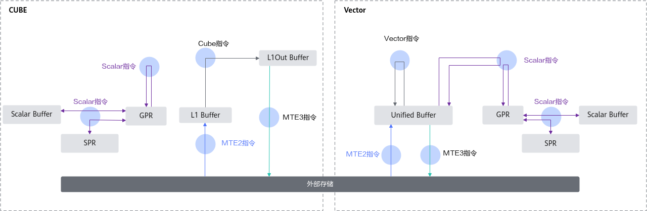 这三个缓冲区构成了Cube计算单元的专用数据通路,使得大规模的矩阵运算能够以极高的吞吐率执行。数据从外部存储(Global Memory)经过L1 Buffer的中转,最终进入L0A/L0B/L0C参与计算。