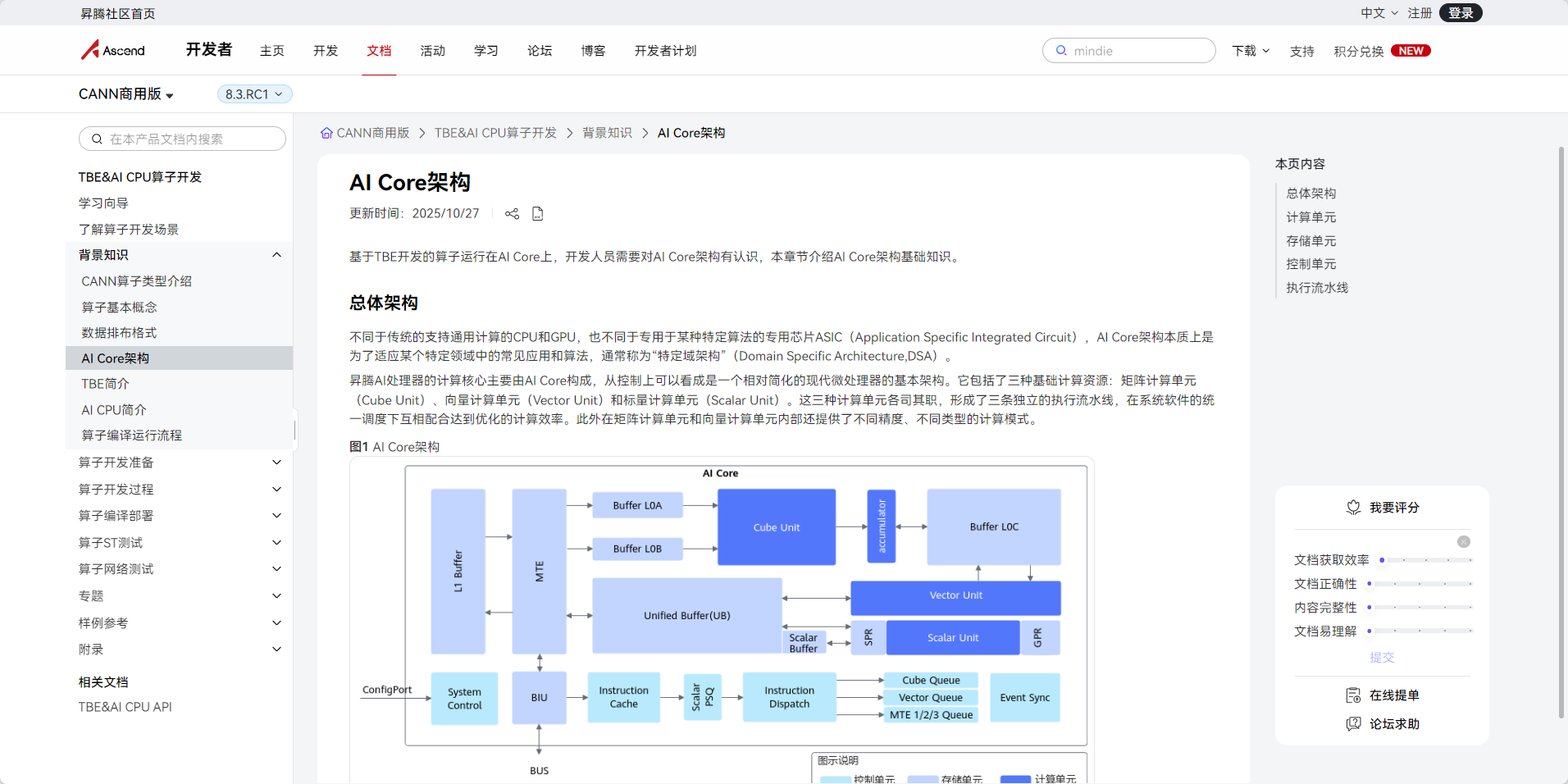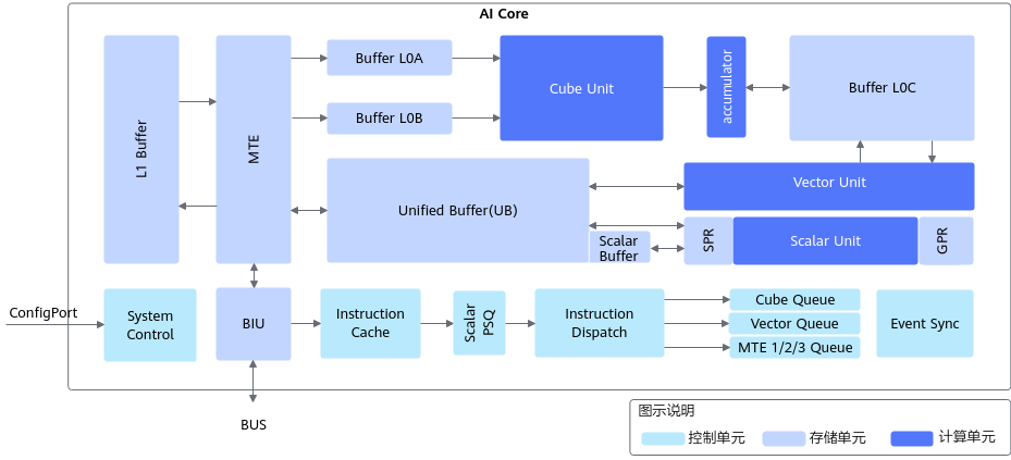 图1:AI Core架构全景图,展示了计算单元、存储单元和控制单元的完整布局(图片来源:昇腾官方文档)