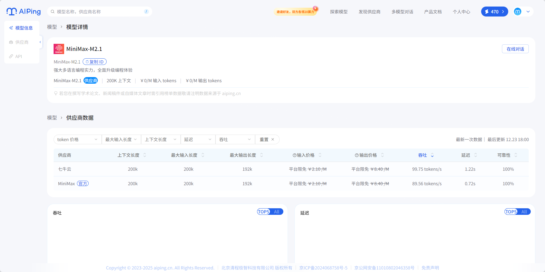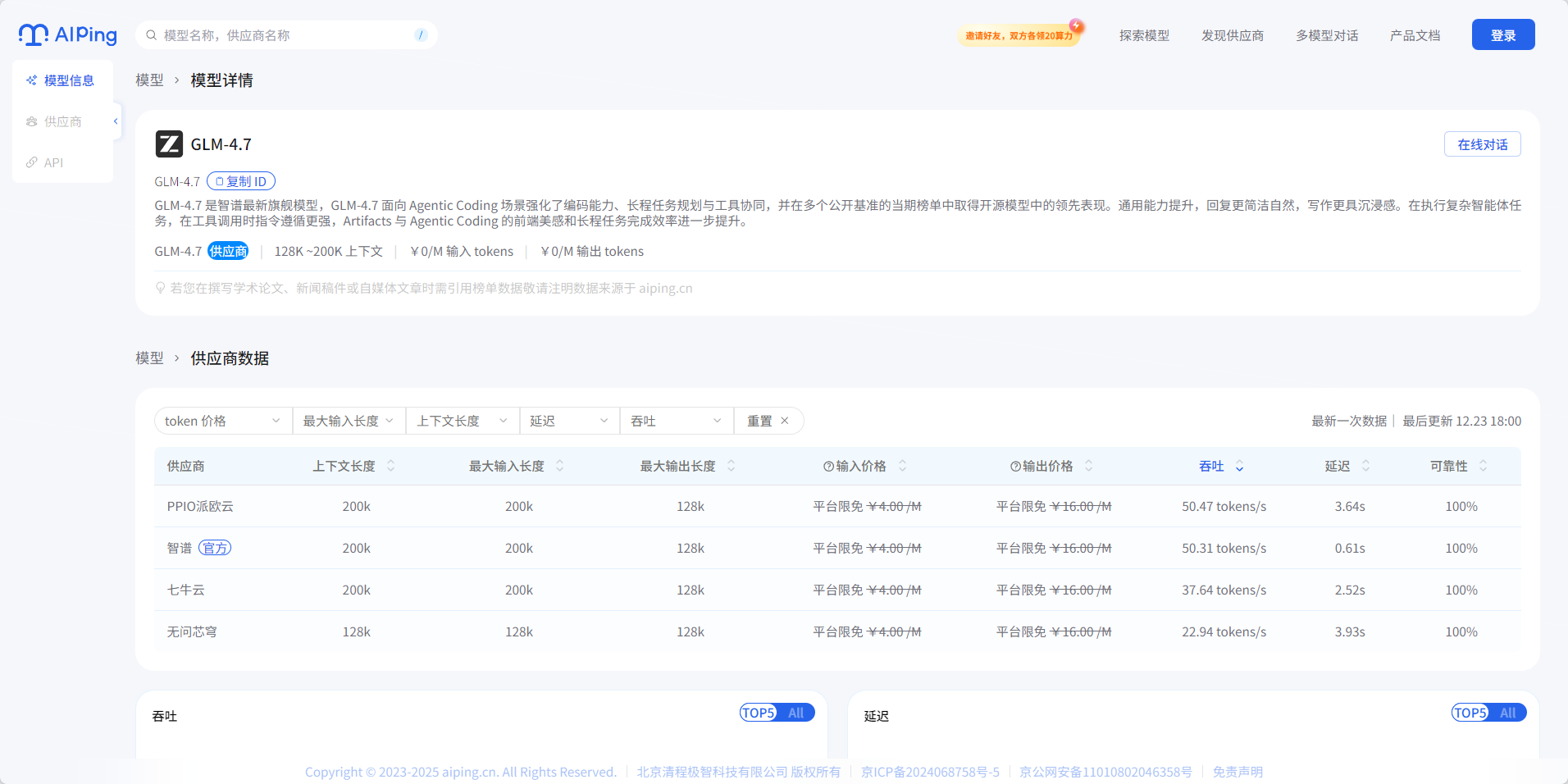 平台核心优势包括:多供应商统一调用——一套接口切换不同供应商;性能数据可视化——实时展示吞吐、延迟、价格、可靠性等关键指标;智能路由——高峰时段自动选择最优供应商保障稳定性。目前 GLM-4.7、MiniMax-M2.1、DeepSeek-V3.2 等旗舰模型可免费体验,更有邀请好友双方各得20元算力点的活动,上不封顶。进入AI Ping 首页