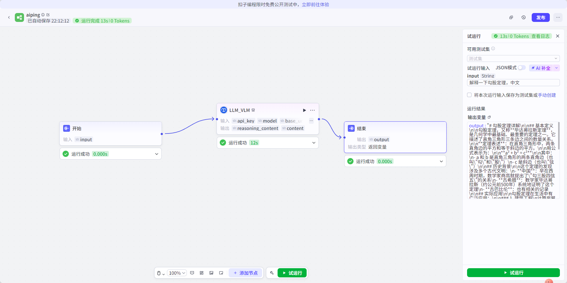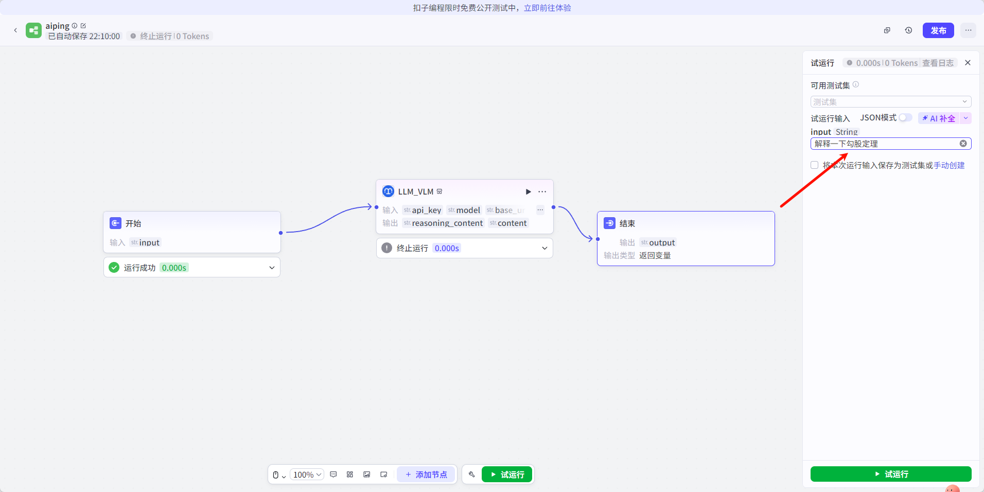- 点击右上角试运行按钮,输入测试消息验证插件是否正常工作