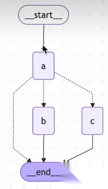 对于条件边笔者这里直接通过代码讲解,使用条件边实现下图结构,下图中的虚线表示条件边,实线表示普通边。