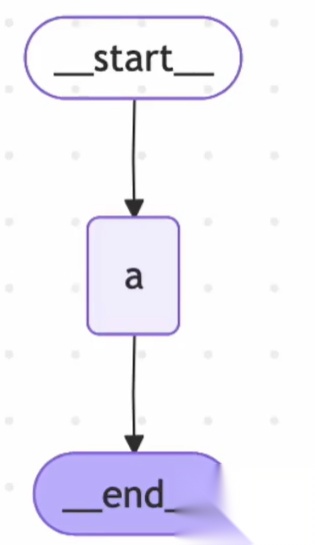 - 编译状态图,将节点加入到图中,定义为"a"节点,同时添加从START节点到"a"节点的边,然后添加从"a"到END的边。这里的START和END都是LangGraph定义的常量节点,仅包含语义信息。最后编译图。