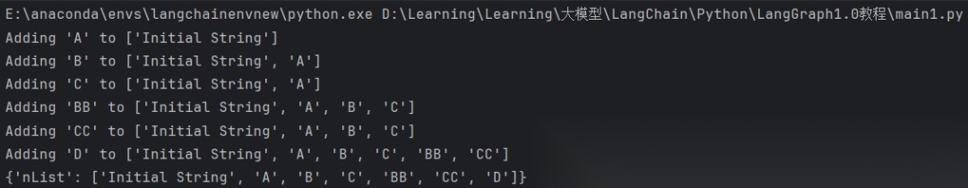以上节点函数执行完成后会对字符串列表进行更新。State 可以被持久化(通过 Checkpointing 机制)。这意味着如果节点执行失败或工作流被中断,可以从上一个检查点恢复状态重新运行,保证了工作流的鲁棒性。