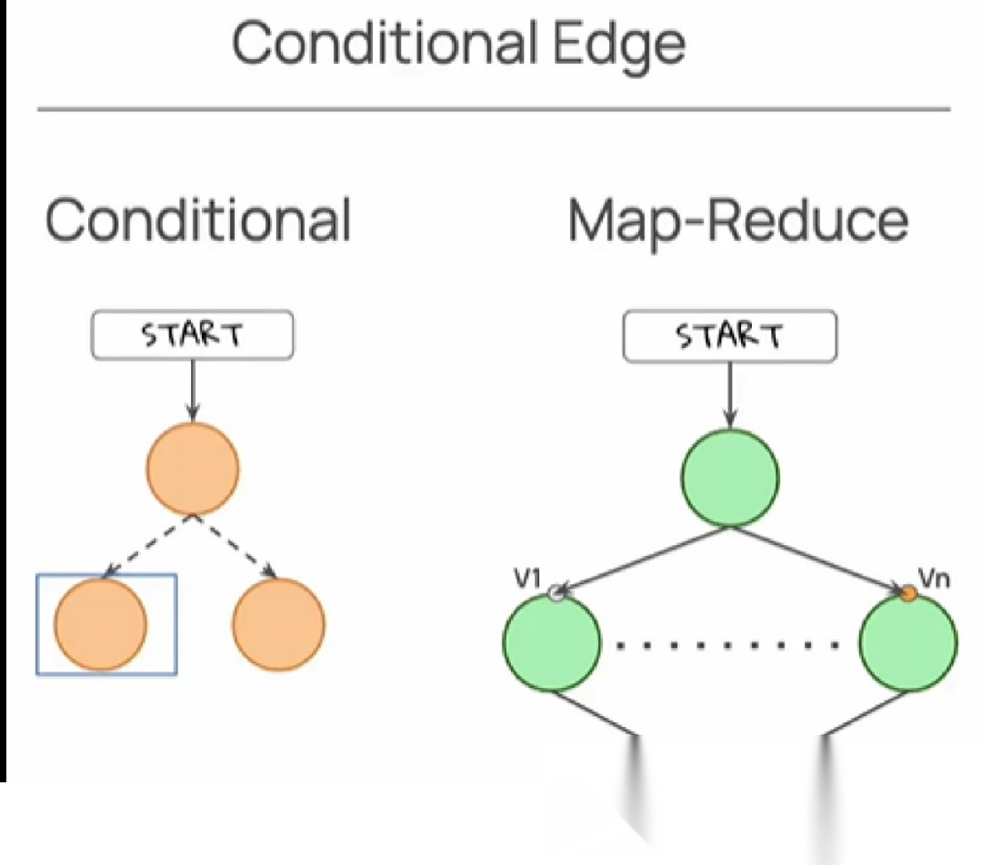 除普通边外,LangGraph还有另一种条件边。条件边允许工作流根据运行时状态动态决定下一步的执行路径。它需要一个路由函数,该函数接收当前状态,并选择下一个要执行的节点。下图左侧根据条件选择将状态传递给下一级左侧节点进行处理。条件边还有一个特殊情况是MapReduce, 它可以创建可变数量的下游节点,并且每个节点都传递了一个唯一值(笔者之后也会讲到)。