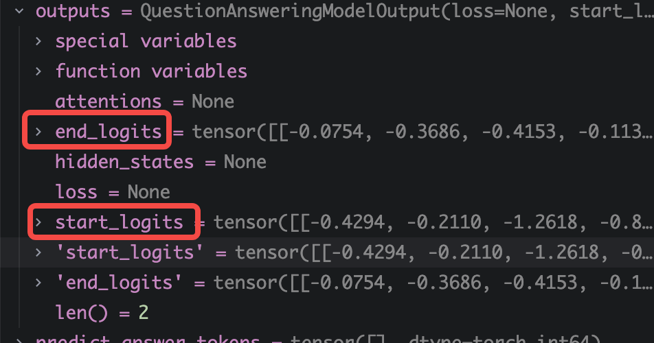 要注意的是,这里模型输出的是start_logits和end_logits,分别表示每个 Token 是答案开头的概率和结尾的"概率"(对数几率)
