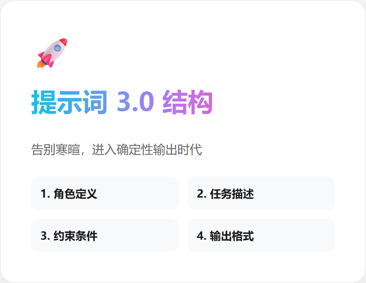 这就是提示词3.0的核心逻辑:结构化输入,确定性输出。