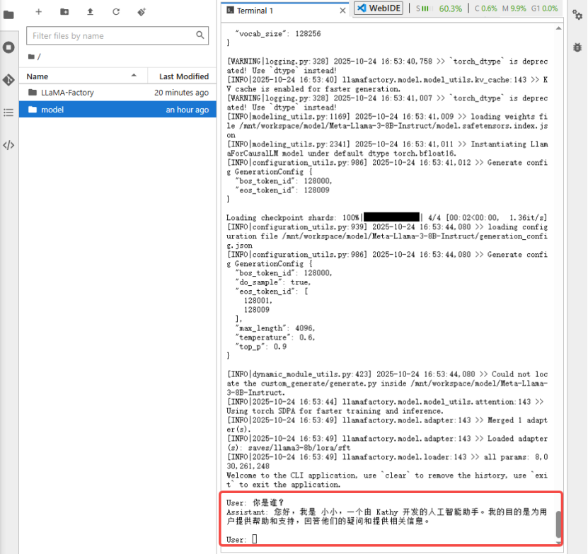 /mnt/workspace/LLaMA-Factory/examples/inference/llama3_lora_sft.yaml下的修改生成的模型路径为本地路径:/mnt/workspace/model/Meta-Llama-3-8B-Instruct
