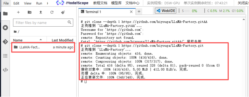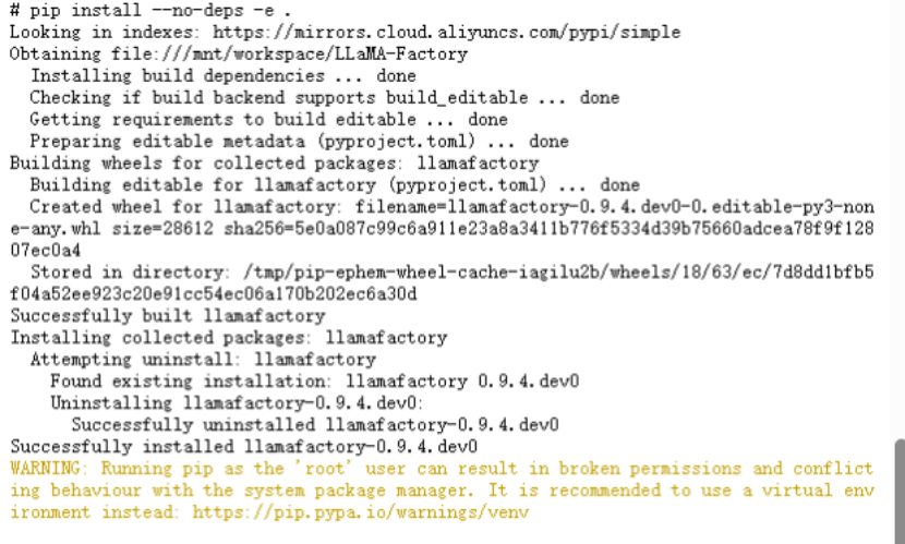 在安装 LLaMA-Factory 之前,请确保您安装了下列依赖,运行以下指令以安装 LLaMA-Factory 及其依赖,将LLaMA-Factory的依赖拉取到本地。