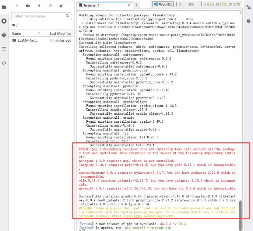 安装LLaMA-Factory相关依赖(可能会遇到依赖冲突):