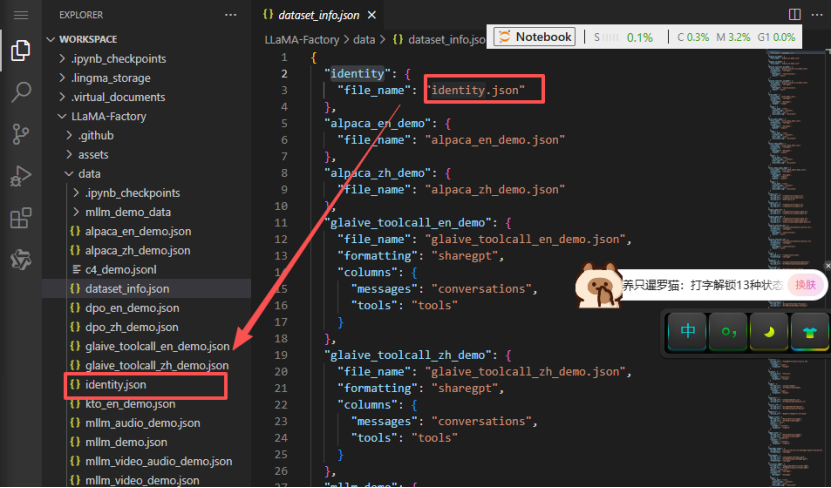 如identity大模型的自我认知的训练集定义,在dataset.json中定义,然后在data的文件夹下创建identity.json的文件。