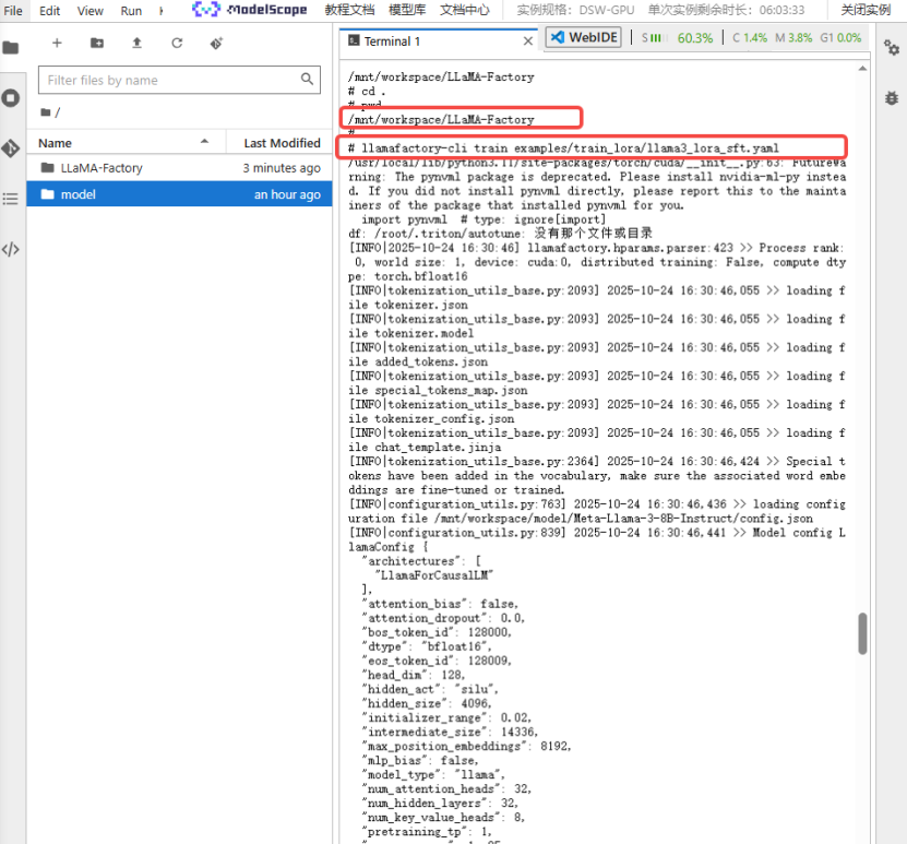 Llama文件夹下example/train_lora微调文件夹下,选择/mnt/workspace/LLaMA-Factory/examples/train_lora/llama3_lora_sft.yaml