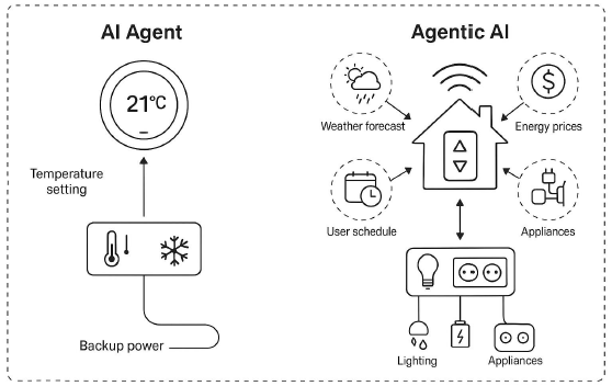 尽管AI Agents在自动化领域取得了显著进展,但其单体架构在处理需要长期记忆、任务相互依赖或动态协作的复杂场景时,很快便会遇到瓶颈。这些局限性催生了向一个更高级范式——Agentic AI的演进。这代表了一次概念上的飞跃:从孤立的、执行具体任务的代理,转向由多个智能实体构成的、为实现宏大目标而协同工作的系统。其核心理念是目标分解与分布式协作。一个高阶的用户目标会被自动分解为一系列更小的、可管理的子任务,然后分配给网络中的不同专业代理。通过结构化的通信渠道(如共享内存或消息队列)和反思性推理机制,这些代理能够协调行动、共享上下文并动态调整策略,从而在不确定性环境中稳健地完成复杂任务。一个形象的比喻是智能家居:单个的智能恒温器是一个AI Agent,而一个能够协调天气预测、电价优化、安防监控等多个专业代理的综合管理系统,则体现了Agentic AI的协同智能。