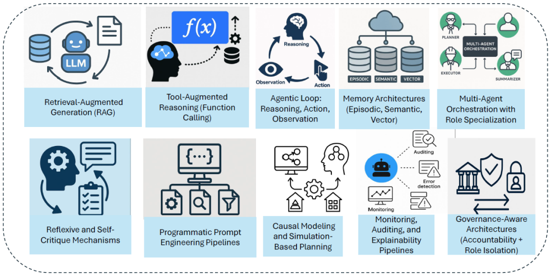 为解决当前 AI Agents 与 Agentic AI 系统在因果推理、可扩展性、协作协调等方面的局限,研究者提出了一系列前沿解决路径。这些方案包括检索增强生成、工具增强推理、反思机制、记忆架构、因果建模、多智能体编排与角色分工、程序化提示工程,以及治理感知型架构等。这些技术旨在缓解现有系统中的幻觉、推理断层、协调失败和扩展性瓶颈。RAG 提供了外部知识的实时接入,Function Calling 赋予智能体执行任务的能力,而反思机制与可解释性框架提升了系统的自我修正和透明性。在多智能体系统中,角色分工与编排机制保障了任务的分布执行与容错性,统一的内存与因果模型支持跨任务的一致推理与协同。此外,治理感知型架构通过角色隔离、审计追踪与合规机制,为系统的安全性与责任归属奠定基础。整体来看,这些技术路线共同构成了通往下一代可扩展、安全且上下文感知的 Agentic AI 系统的重要演进图谱。