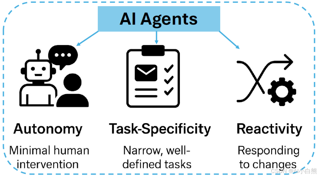 AI Agents的能力可以通过三个核心特征来概括。首先是自主性(Autonomy),即在部署后仅需少量甚至无需人类干预即可独立运作的能力。一旦被初始化,代理便能自主感知环境输入、进行推理并执行任务,这使其能够被大规模部署于客户支持机器人、会议自动安排等难以进行持续人工监督的应用中。其次是任务特定性(Task-Specificity)。AI Agents通常为狭窄且明确定义的任务而构建,例如过滤垃圾邮件或查询数据库。这种专业化使其在自动化特定流程时,能够实现通用模型难以企及的效率和精度。最后是反应与适应性(Reactivity and Adaptation)。代理系统内置了与动态输入交互的机制,能够响应实时的用户请求或环境变化。一些代理还具备基础的学习能力,可以通过反馈循环或更新上下文来逐步优化自身行为,这在个性化推荐或对话管理等场景中尤为重要。这三个特征共同构成了AI Agents的基石,使其成为连接预训练模型与特定领域应用的关键桥梁。
