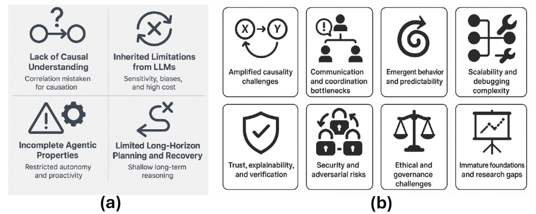 尽管 Agentic AI 作为多智能体系统的新范式,在任务分解、协作执行和复杂问题处理方面展现出巨大潜力,但在实际应用中仍面临诸多结构性挑战。最核心的问题是因果推理能力的缺失被系统放大,多个智能体在缺乏对因果关系理解的情况下协作,容易导致任务冗余、输出冲突及错误信息的级联传播,进而形成系统性错误。特别是当某一关键智能体发生幻觉或误判时,整个流程可能被误导。此外,当前智能体之间主要通过自然语言进行信息交换,缺乏统一的任务语义与上下文同步机制,易产生语义漂移,降低了通信效率与协作鲁棒性。随着智能体数量和交互复杂性的提升,系统的可预测性进一步下降,可能出现计划循环、逻辑冲突及非预期行为,尤其在高风险场景中构成隐患。同时,由于智能体具备异步执行、自主记忆和不透明的推理过程,系统调试和责任追溯变得更加困难。更根本的问题在于,目前缺乏统一的架构标准、通信协议和可验证机制,难以支撑对安全性、可解释性和伦理性的高要求。因此,Agentic AI 的发展亟需在因果建模、协调机制、系统安全与伦理治理等方面构建坚实基础。