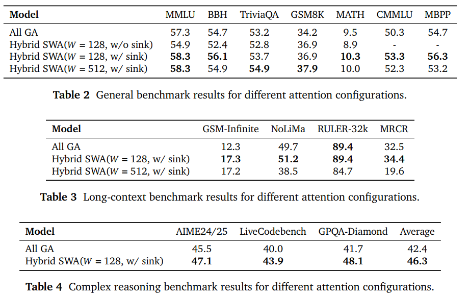 - Attention Sink Bias 是“救命稻草”:当窗口只有 128 时,如果不加 Attention Sink Bias,模型在 MMLU、BBH 等通用榜单上会出现明显的性能退化。一旦加上这个“偏置项”,性能不仅止跌,甚至反超了全全局注意力的 Baseline。