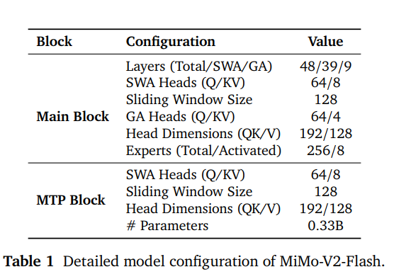 - SWA (39 层) :每层窗口大小仅为 128 个 token,极大降低了 KV-cache 存储压力 。