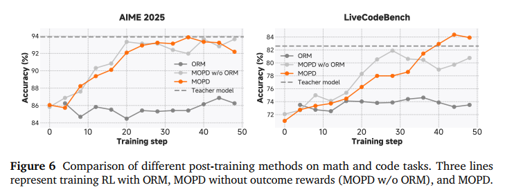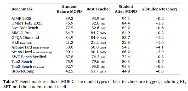 结果表明,学生模型在 AIME 数学、代码等榜单上,不仅保住了老师的最高水平,甚至在某些项目上超越了最好的老师(如 AIME 2025 达到 94.1 分)