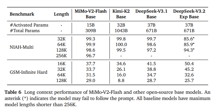 在 32K 到 256K 范围内,检索成功率接近 100% 。在极端压力测试 GSM-Infinite 中,随着文本变长(从 16K 到 128K),性能几乎不衰减。相比之下,某些竞争对手在 64K 之后性能会出现断崖式下跌,证明了小米 Hybrid SWA 架构 的优越性。