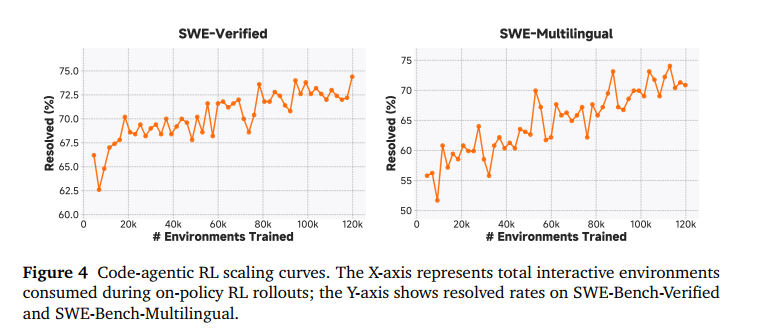 此外,小米团队通过实验发现,在多样化的 Agent 环境(如代码、搜索、终端等)中增加强化学习的计算量,带来的收益远超想象。在约 120,000 个(12万) 真实环境中让模型进行在线采样和更新,让模型在 SFT 的基础上,在 SWE-Bench(软件工程考试)上实现了性能的二次飞跃。