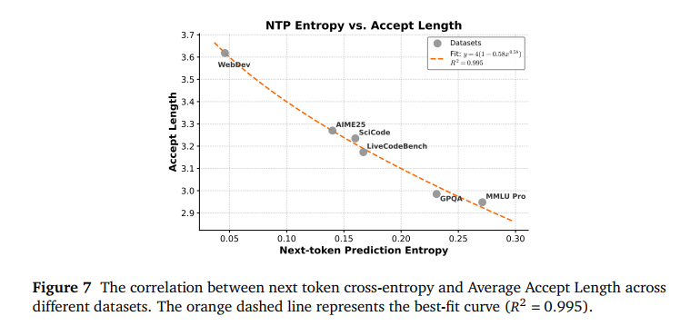 小米团队发现,模型的**不确定性(熵)**越低,MTP 预判就越准,提速就越快。