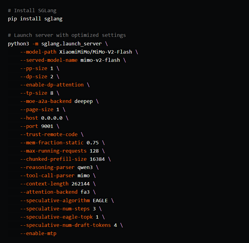 SGLang 是目前运行 MiMo-V2-Flash 最理想的引擎,支持 MTP 加速。