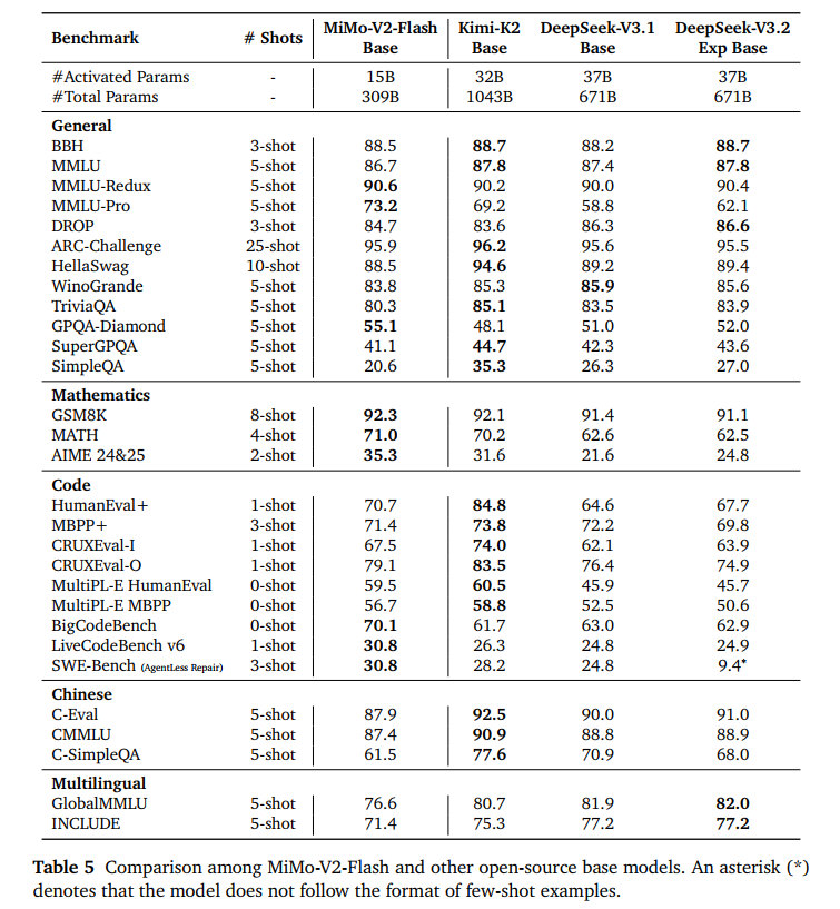 报告中还提到一个非常关键的对比点:在长文本评测中,MiMo-V2-Flash 的表现甚至超过了 Kimi-K2-Thinking。Kimi-K2 采用的是全全局注意力(Full Global Attention),而小米采用的是混合滑动窗口。这一事实证明,针对长文本进行“稀疏化”和“分工化”设计的架构,在处理长逻辑链任务时,不仅更省资源,性能上限也更高。