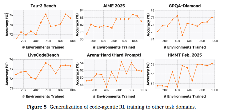 报告还指出,大规模的代码 Agent RL 训练不仅提升了修代码的能力,还产生了一种“泛化”效应。虽然模型是在修 Bug,但它的数学、通用代码和逻辑推理能力也随之大幅提升。