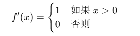 ReLU函数的定义是 f(x)=max(0,x)f(x) = \max(0, x)f(x)=max(0,x),其导数为: