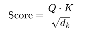 在自注意力机制中,查询(Q)与键(K)向量之间的点积计算相似度分数: