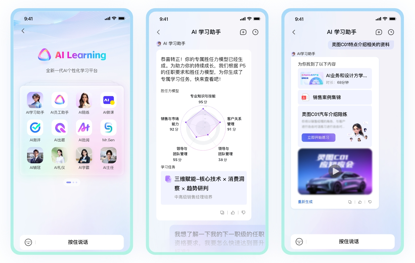 ● AI 学习助手:基于岗位、绩效数据精准推荐课程,语音唤起即可秒查知识库,随需而学、即查即用