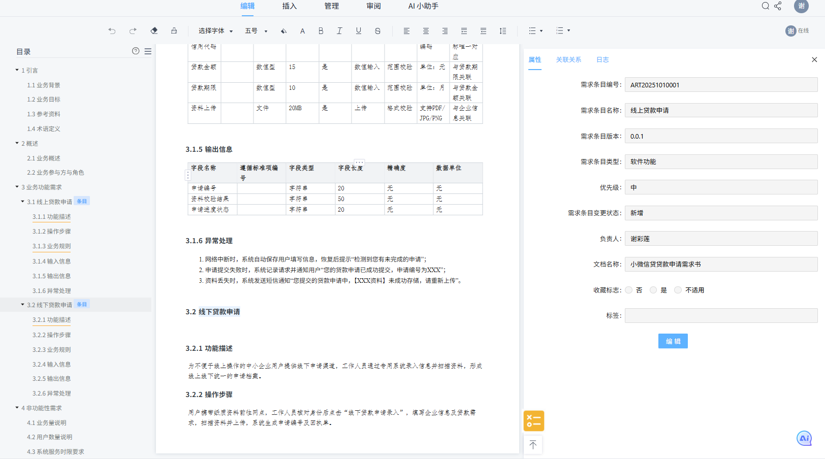 | 🧠 智能创建与填充 | - 自动生成:根据主题或片段,智能生成需求文档初稿、测试用例等。 - 自动标记与分类:利用AI/ML能力,自动为资产添加标签,并智能推荐其应挂载的资产节点。 |