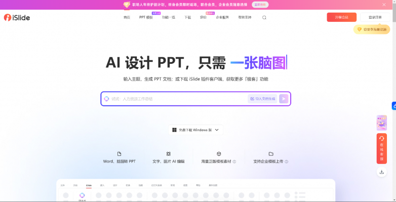 iSlide是一款功能全面的PPT插件,虽然它的AI生成功能不如其他工具强大,但其丰富的模板库和多样化的场景适配让它成为许多用户的首选。
