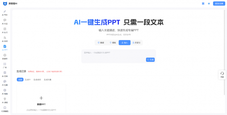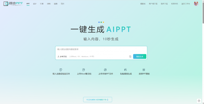 秒出PPT是最开始做ai ppt的网站之一,一直潜心将这一块做到最好。支持用户一键生成PPT,还支持导入文档生成或者是自由输入生成。