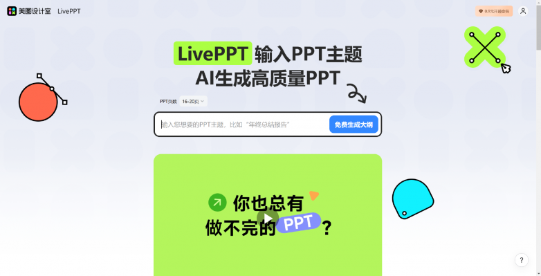 美间PPT支持一键生成,虽然功能上没有太多亮点,但其PPT美化功能为它加分不少,适合日常使用。