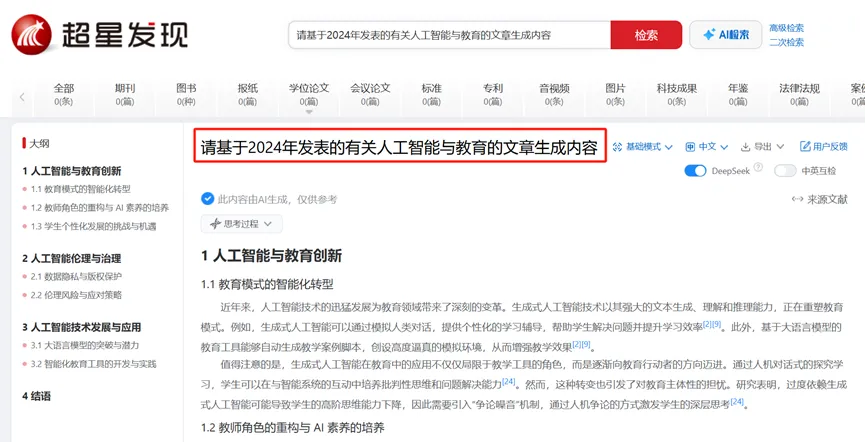- 超星发现中AI生成的内容主要参考的是中文文献,外文文献以国内的英文期刊为主;