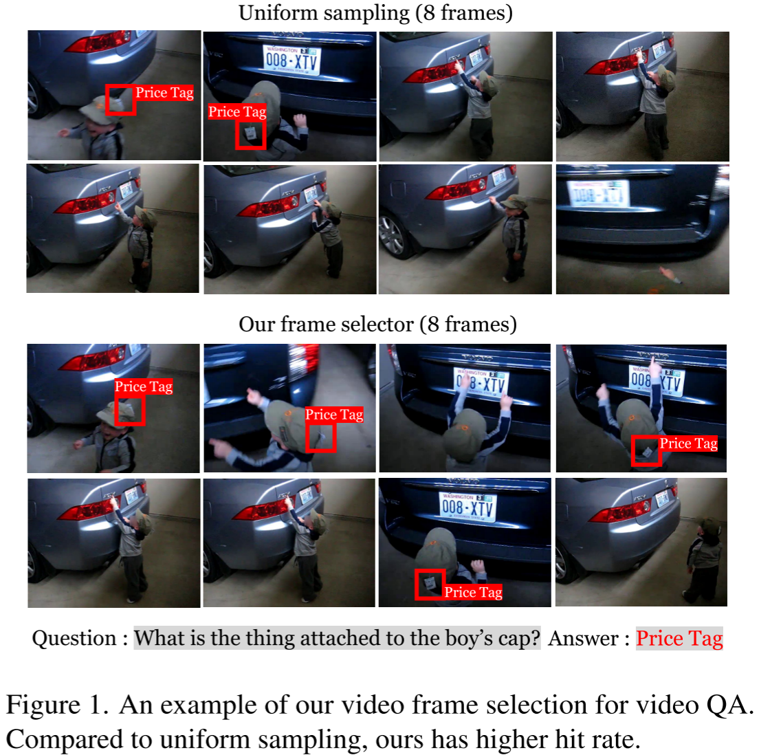 1. 关键信息可能被跳过 每隔6秒才采样一帧,如果关键动作发生在这6秒之间呢?就像图1中展示的例子,问题是"男孩帽子上贴着什么?",答案是"价格标签"。均匀采样可能完全错过展示价格标签的帧。