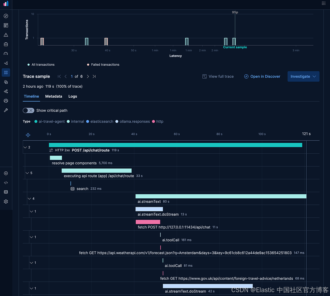 另一个特定于我们 AI SDK 埋点的细节是,我们需要通过 experimental_telemetry: { isEnabled: true } 启用遥测数据的生成。结合这两组配置,OpenLit 将生成 traces,展示我们应用中不同的工具调用,以及对 Elasticsearch 的关键请求,用于持久化我们的语义记忆。