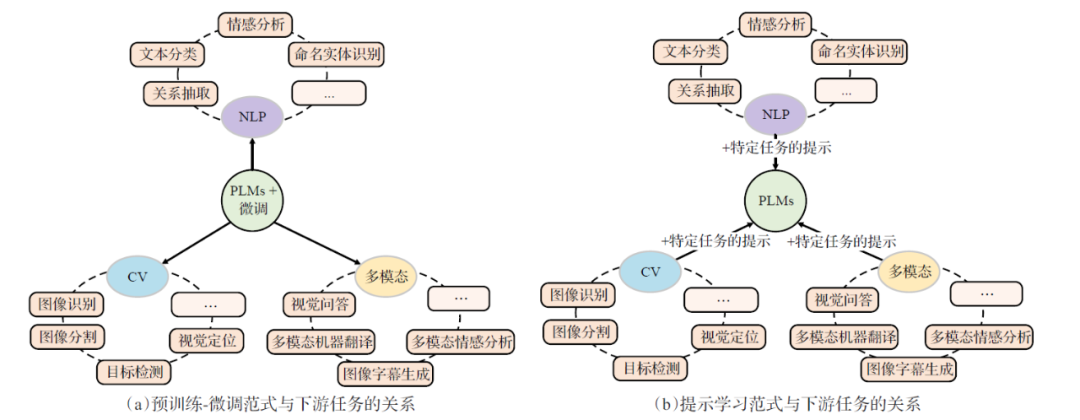 图注:传统范式(a)需要为每个下游任务微调模型;提示学习范式(b)通过特定提示,使PLMs适应多任务,灵活性更高。