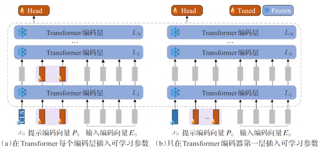 图注: VPT在Transformer的输入端插入可学习的视觉提示(Prompt),仅优化提示参数,实现CV领域的参数高效微调。