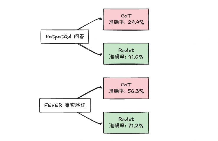 - 🔥 在信息检索类任务中,ReAct 比传统方法提升 20-40%,比如问答、知识库查询等场景