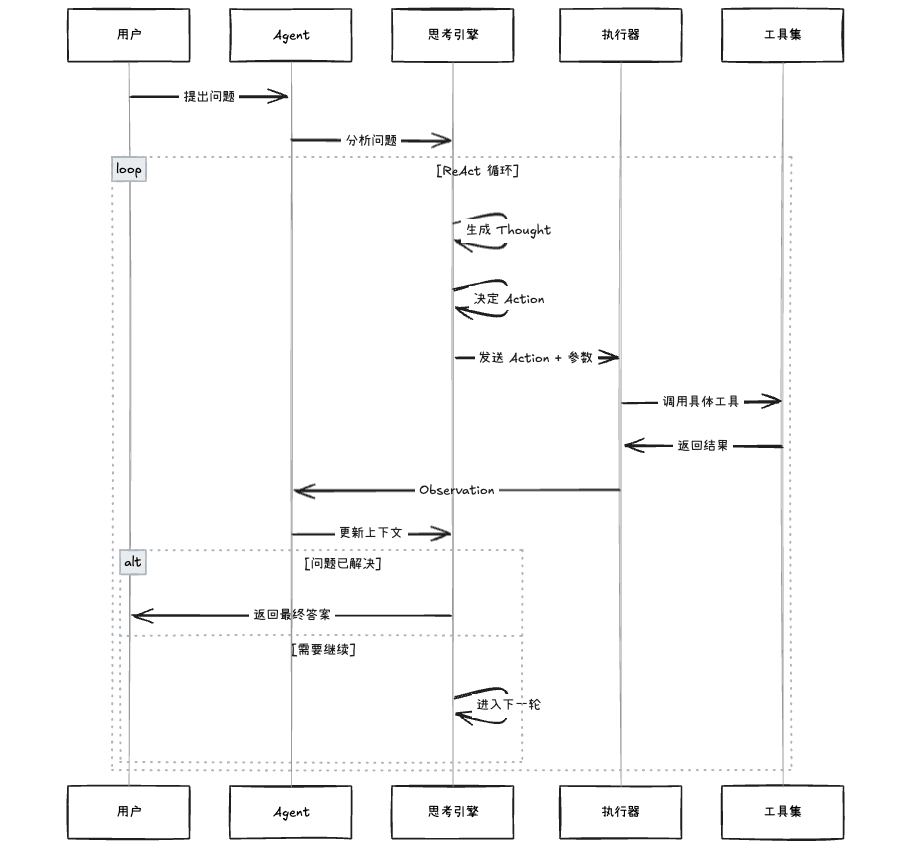 这就是 ReAct 的本质:**思考(Thought)→ 行动(Action)→ 观察(Observation)→ 再思考 → 再行动……**的闭环流程。