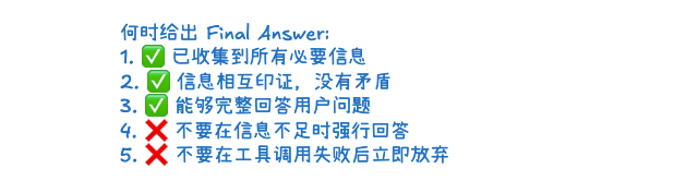 在提示词中直接告知模型终止条件,比如“当你认为已经获取足够信息,能准确回答问题时,直接输出最终答案,停止调用工具”。