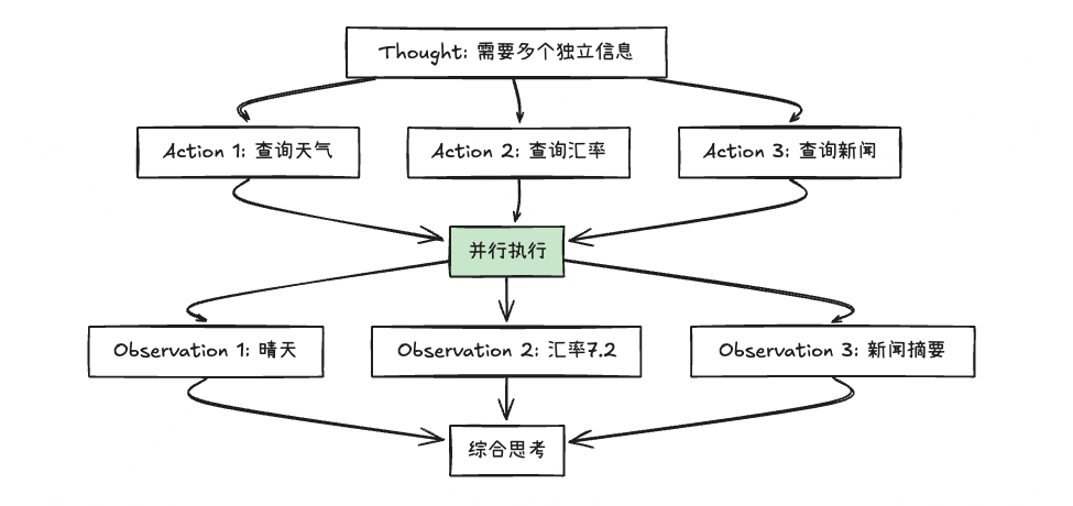适用场景:任务中包含多个独立的工具调用,比如同时查询“北京今日天气”和“上海今日天气”,不需要先后顺序。
