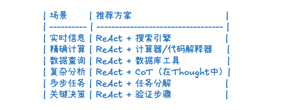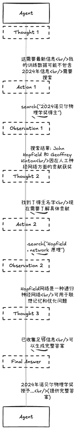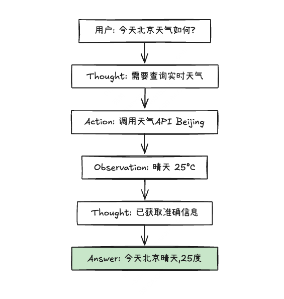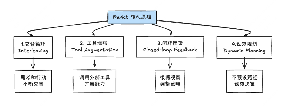 - ✅ 推理与行动交替进行:不一次性规划所有步骤,边思考边执行,灵活应对变化