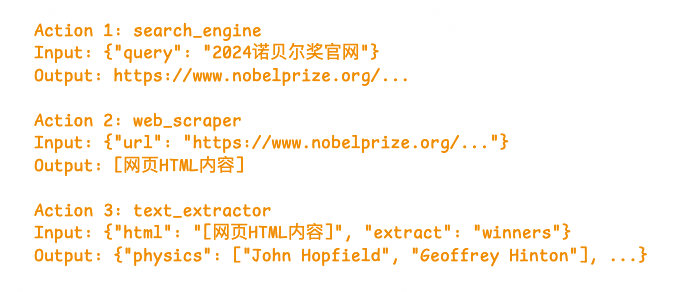 比如模型调用搜索引擎查询“2024年诺贝尔物理学奖”,如果第一次搜索结果不完整(观察),下一轮思考就会调整关键词,重新搜索(行动),直到获取准确信息。