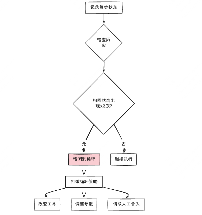 若模型反复执行相同的思考和行动(比如一直用同一个关键词搜索),则判定为陷入循环,让模型重新分析任务,调整策略。