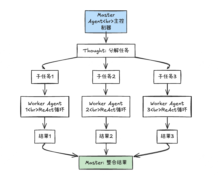 解决方案:分层处理,上层 ReAct 负责拆分任务、分配子任务,下层 ReAct 负责执行具体子任务(比如数据提取、报告生成、可视化)。