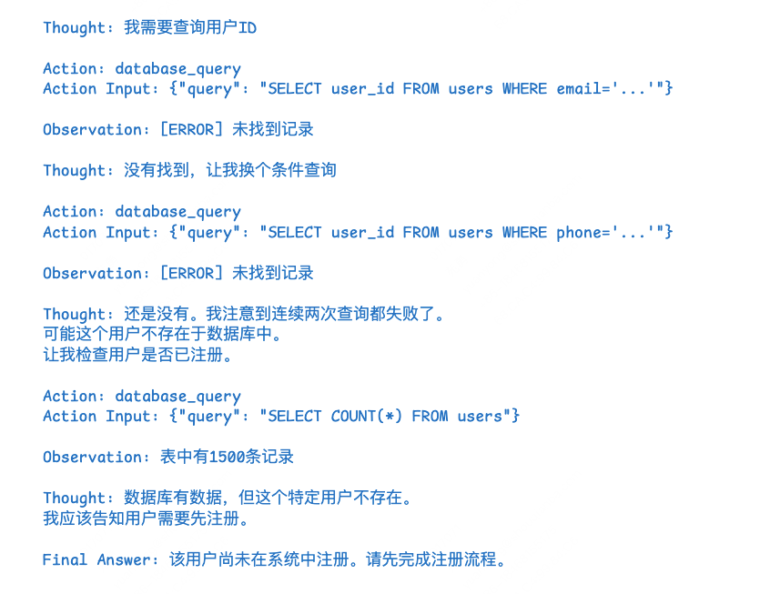 解决方案:在每次行动后加入“自我验证”步骤,让模型检查行动结果是否正确,若不正确则调整策略重试。