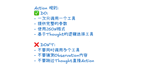 明确工具的使用规则,比如“没有必要时不调用工具”“调用工具必须填写完整参数”“一次只调用一个工具”等,减少无效调用和格式错误。